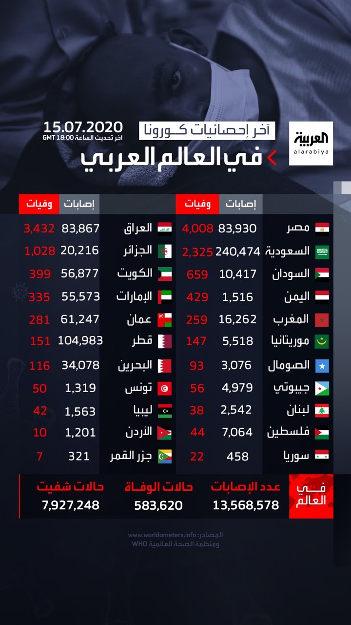 آخر إحصائيات كورونا في العالم العربي 15/07/2020 إنفوجراف العربية